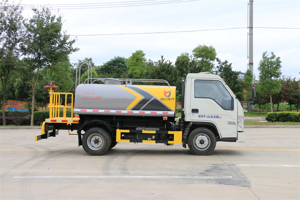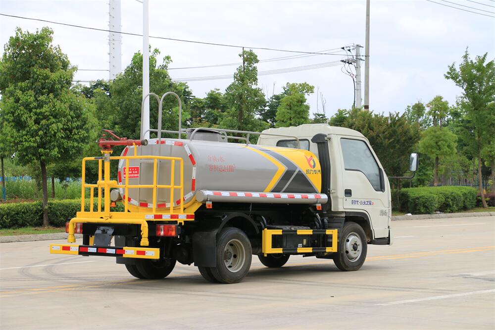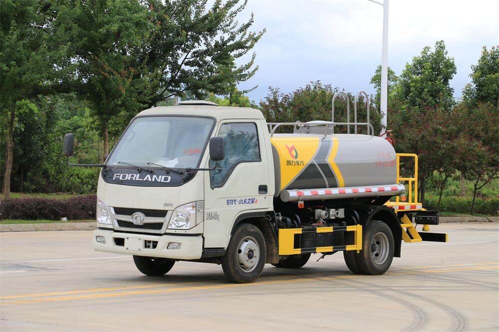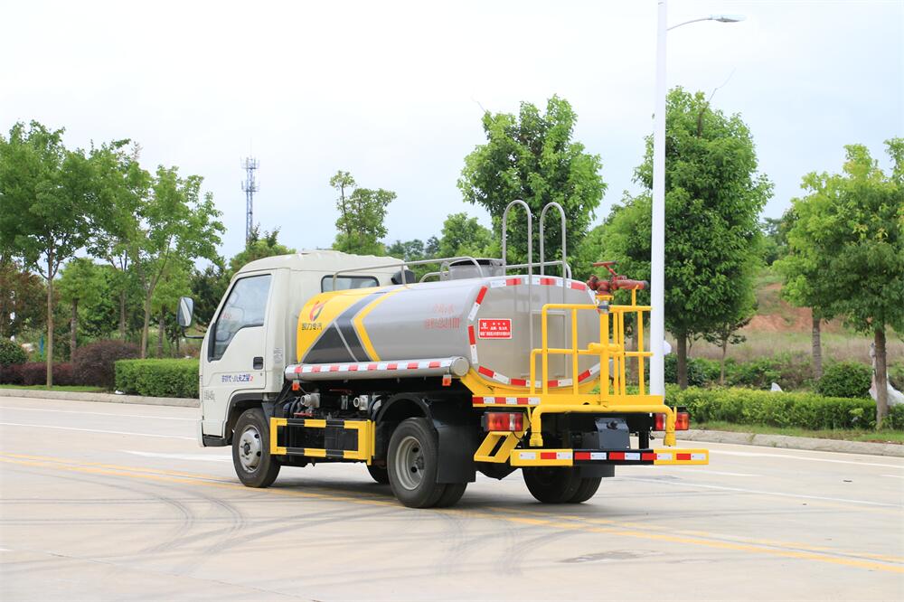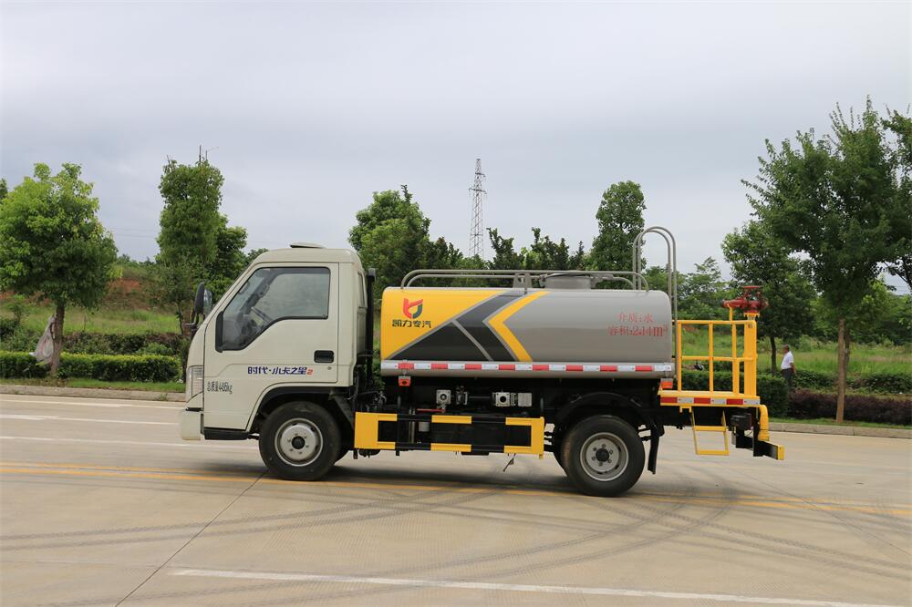 灑水車(chē)前裝有鴨形噴嘴或圓頭沖嘴,后面裝有圓柱開(kāi)灑水噴嘴或蓮蓬頭噴嘴,后部有一工作平臺(tái),裝配有水炮。后部還可裝8個(gè)噴嘴(選裝)。