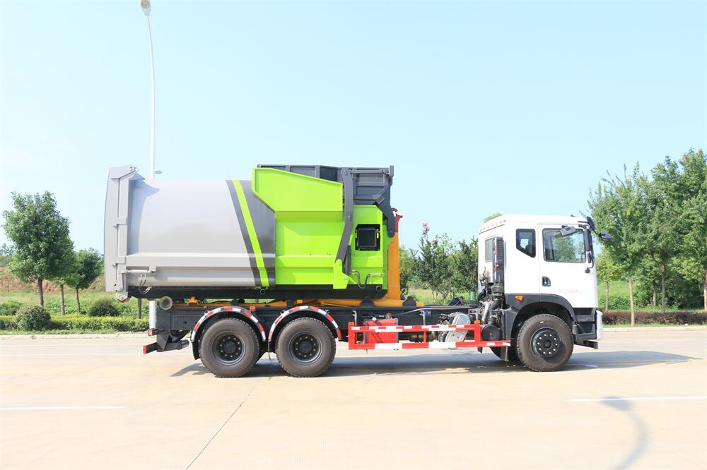 勾臂式垃圾車(車廂可卸式垃圾車)介紹: 車廂可卸式垃圾車又叫拉臂式垃圾車,是一種采用高新設計可伸縮的鉤臂,實現(xiàn)垃圾廂的二次吊裝,自吊上放下,可自行傾倒垃圾的環(huán)衛(wèi)設備。 拉臂式垃圾車結構簡單,操作穩(wěn)定方便,裝卸效率高,機械化程度高,節(jié)省人力。鉤臂垃圾車一車可帶多個垃圾廂,在裝卸的運輸過程中可有效地避免二次污染。 拉臂垃圾車采用高新設計可擺動的鉤臂,垃圾箱由框架、開啟油缸、滑輪、后門和若干加強框架與鋼板焊接而成。調換貨廂快捷方便,貨廂上帶蓋(倒垃圾時可翻開),鉤臂垃圾車垃圾廂體可選用碳鋼、不銹鋼材質、內部采取環(huán)氧樹脂防腐處理,改裝部分與原車底盤為可分離式,維修方便且保持了原車的機動性及行駛性能。