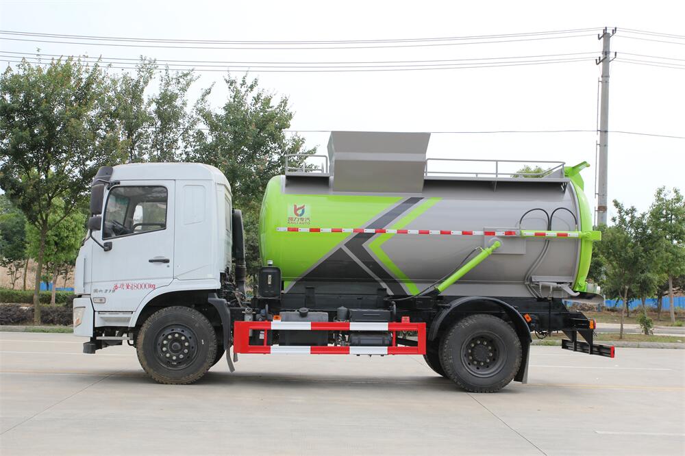 上裝配置:罐體容積10m3,配備120L/240L掛桶提升翻轉(zhuǎn)機(jī)構(gòu),液壓系統(tǒng),后蓋液壓鎖緊開(kāi)啟,罐體可以舉升自卸,尾部帶自流閥;用于運(yùn)輸液態(tài)垃圾,其特點(diǎn)操作簡(jiǎn)單,密封性好,無(wú)泄漏,無(wú)異味;可選裝固液分離功能,推板擠壓功能,常用于餐館的垃圾轉(zhuǎn)運(yùn)處理。