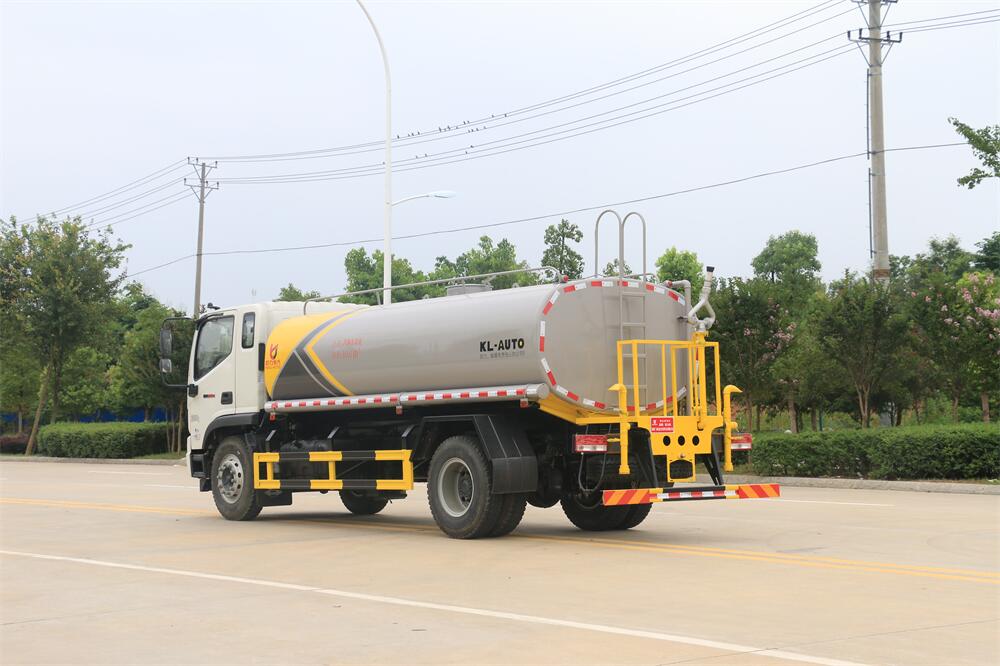 灑水車前裝有鴨形噴嘴或圓頭沖嘴,后面裝有圓柱開(kāi)灑水噴嘴或蓮蓬頭噴嘴,后部有一工作平臺(tái),裝配有水炮。后部還可裝8個(gè)噴嘴(選裝)。