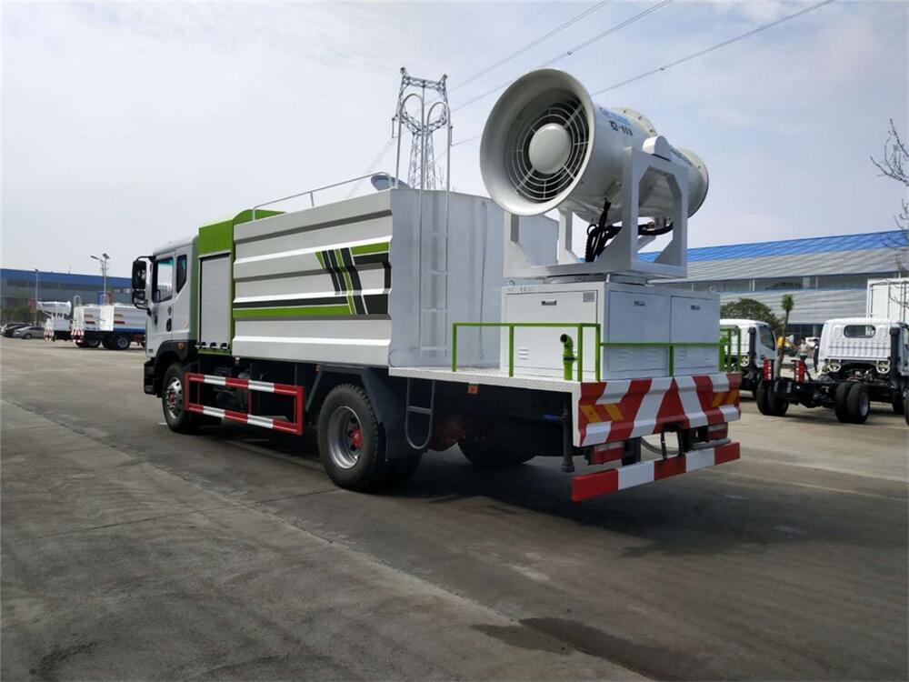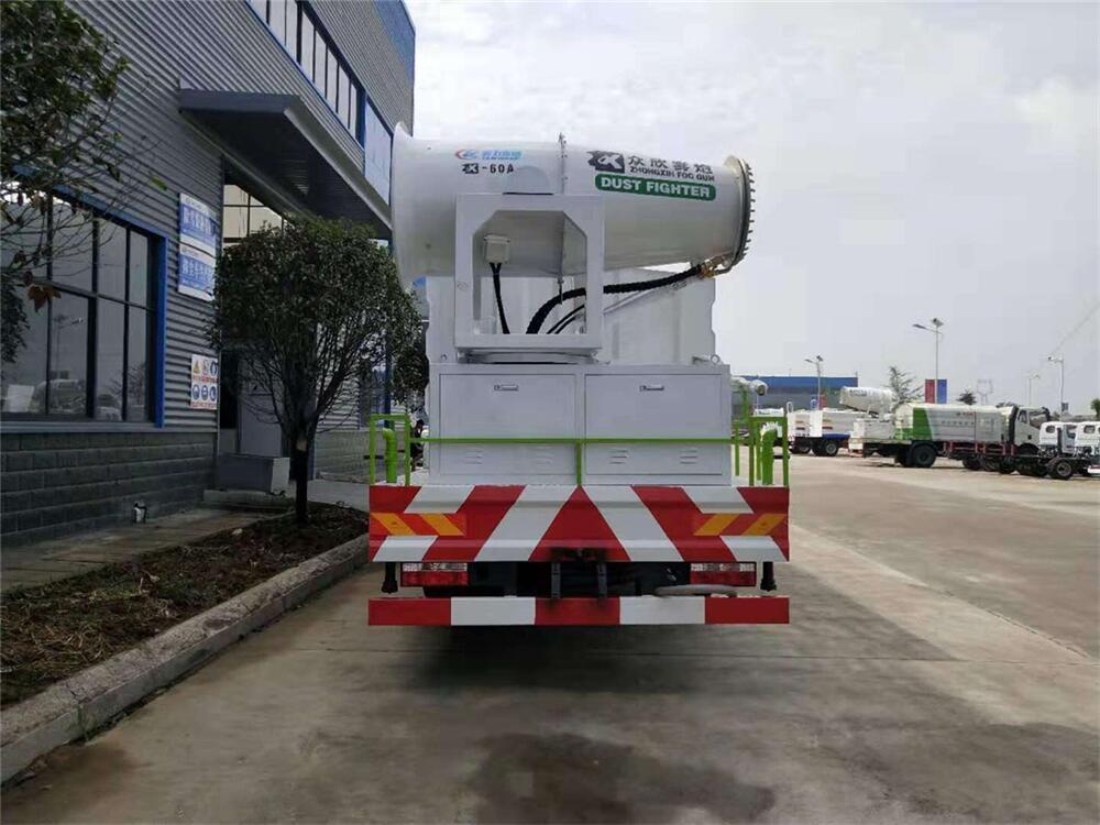 上裝配置:罐體容積為 12立方,選配風(fēng)送式霧炮機(jī)組射程30米、40米、50米、60米、80米、100米、120米霧炮,罐體鋼板為4mm碳鋼Q235材質(zhì),罐內(nèi)隔板具有防波作用,以減輕汽車行駛時罐體液體沖擊,罐體及整車外形尺寸按照公告。帶大功率專用灑水泵,泵可自吸自排,整車前沖、后灑、側(cè)噴、帶65消防接口,后平臺配CLW-50、CLW-60、CLW-80、CLW-100、CLW-120型風(fēng)送式霧炮機(jī)組;罐體前封頭配大功率柴油發(fā)電機(jī)組;前封頭帶水位計,后平臺主管路帶1寸澆花接口,后爬梯。帶兩根輸水管及陰陽端。罐體顏色:銀/灰/綠,罐體兩側(cè)噴“多功能抑塵車”字樣,貼反光標(biāo)示。