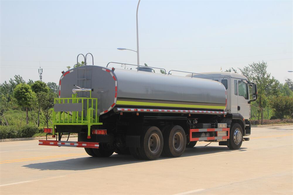 灑水車前裝有鴨形噴嘴或圓頭沖嘴,后面裝有圓柱開灑水噴嘴或蓮蓬頭噴嘴,后部有一工作平臺,裝配有水炮。后部還可裝8個噴嘴(選裝)。